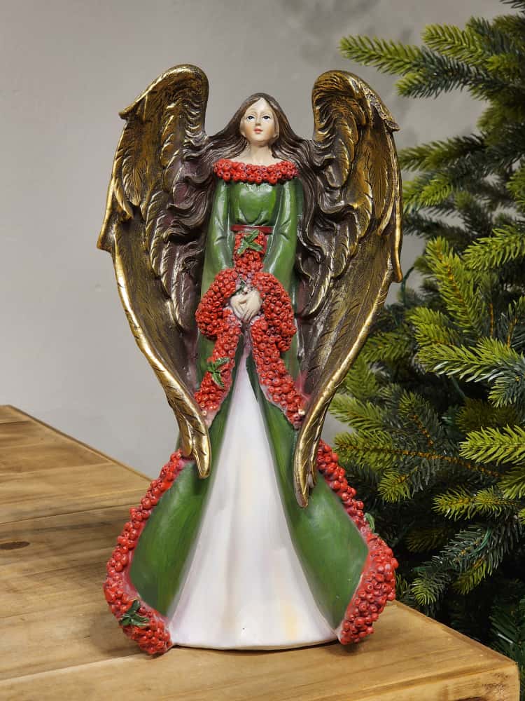 DETALHES DO PRODUTO ANJO EM RESINA VERMELHO E VERDE COM MICRO BERRYS