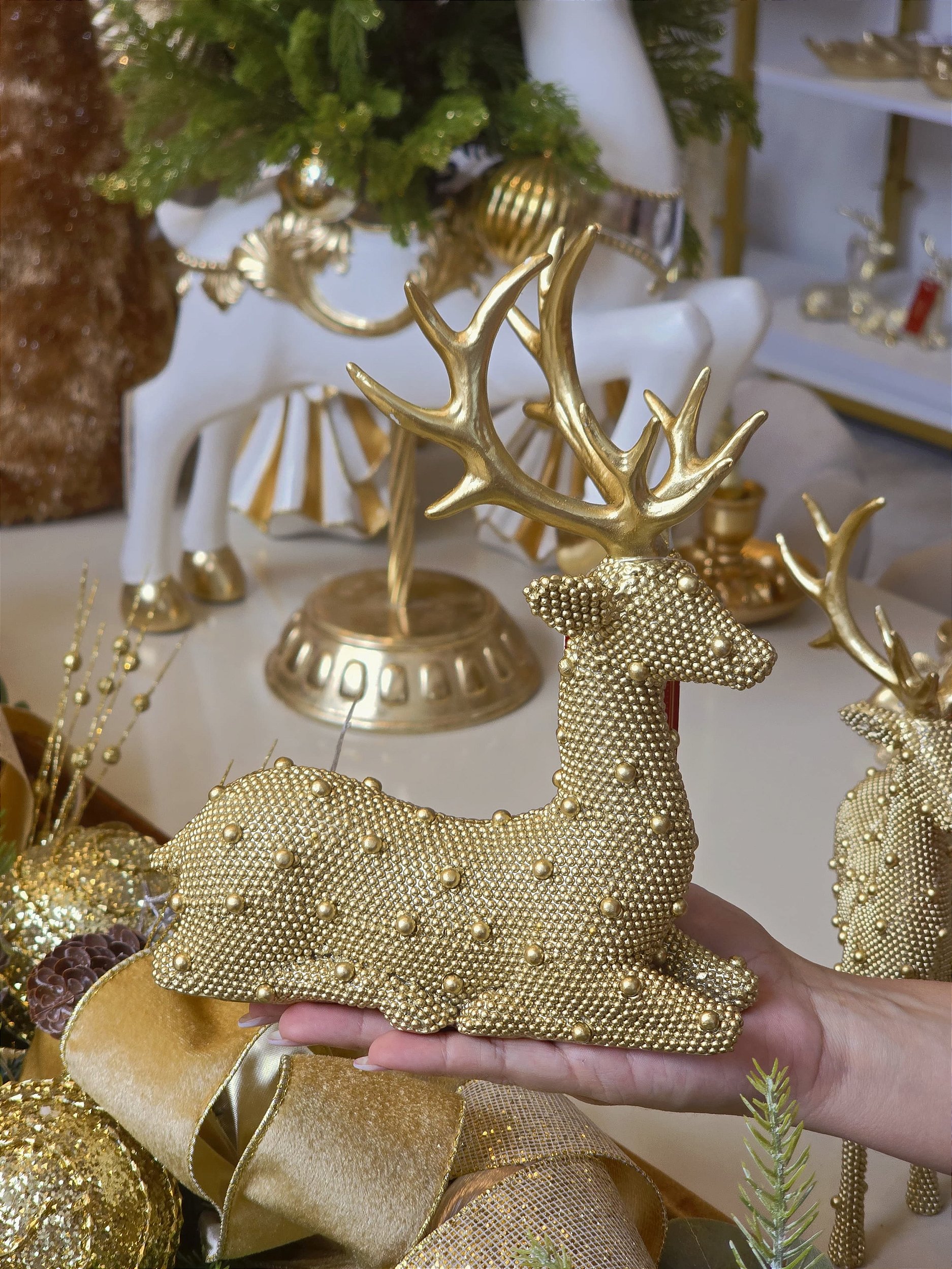 RENA DEITADA COM BOLINHAS DOURADA RESINA 22CM - PRÉ VENDA 2026