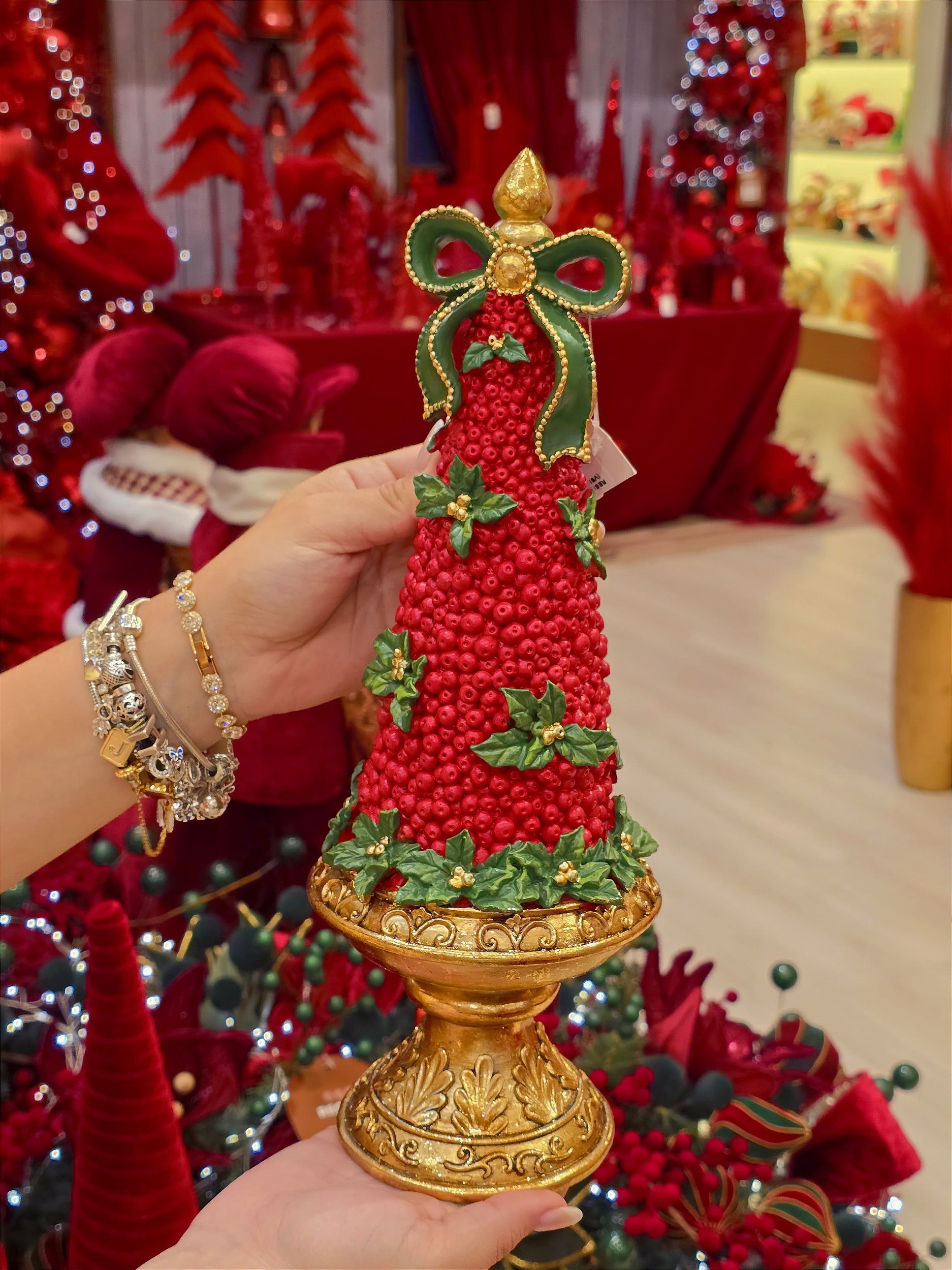ÁRVORE EM RESINA VERMELHA COM FOLHAS DE BERRY E LAÇO VERDE