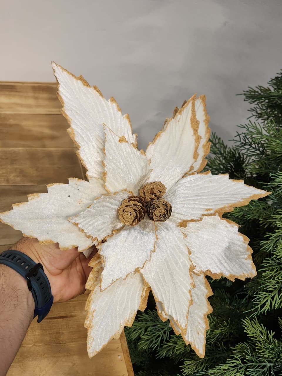 FLOR BICO DE PAPAGAIO COM PINHA BRANCO OFF AVELUDADO 24CM