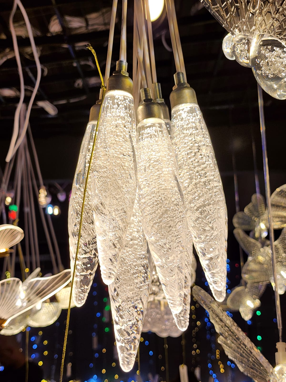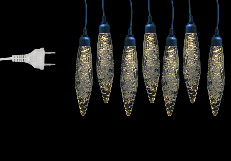 NOVIDADE PENDENTE ILUMINADO GOTA COM FORMATO DE CRISTAL, POSSUI 10 PENDENTES EM FORMATO DE GOTA COM 18CMX3,9CM POR 1,80CM DE CAIMENTO. FICA UM ESPETÁCULO PARA POR NA ÁRVORE