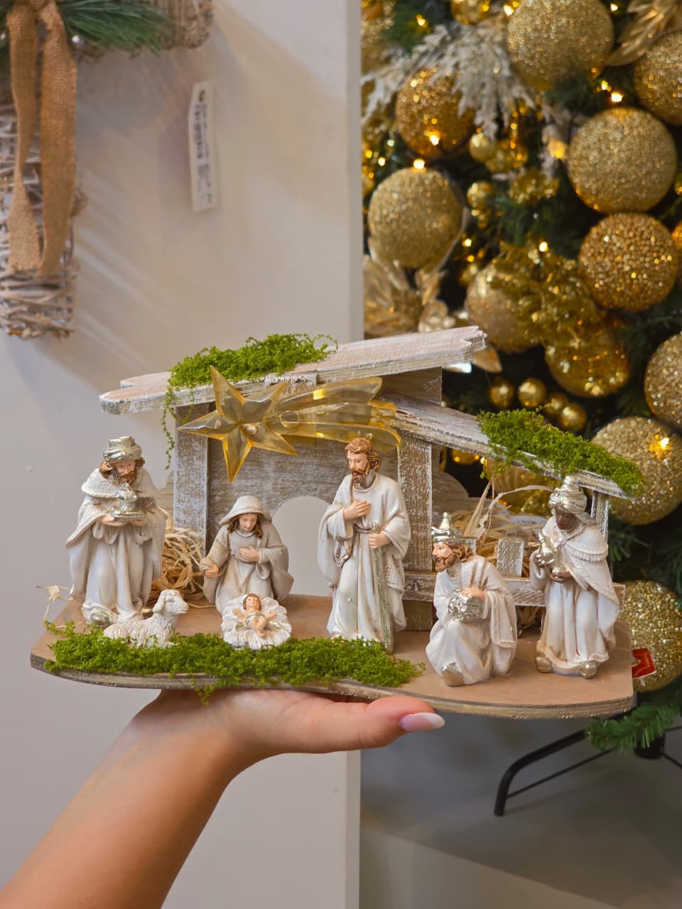 PRESÉPIO EM RESINA COM ESTÁBULO EM MADEIRA COM LUZ DE LED NA ESTRELA