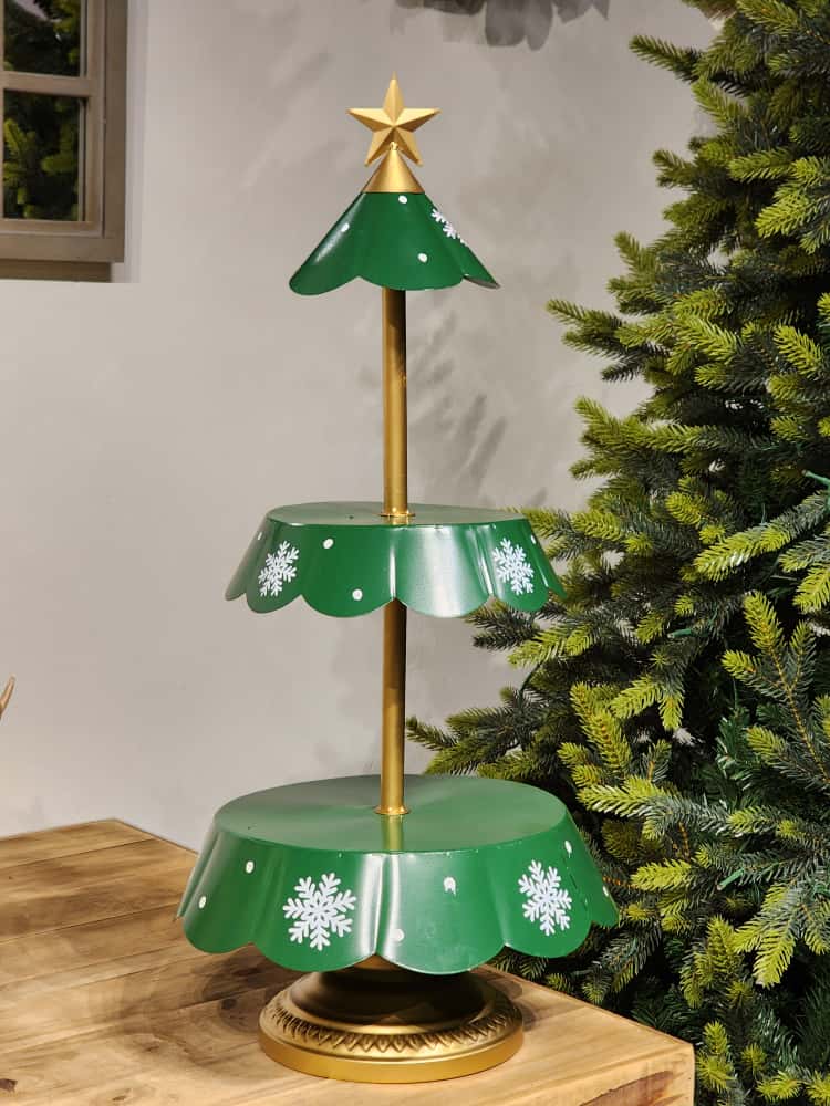 DETALHES DO PRODUTO SUPORTE EM FORMATO DE ÁRVORE EM METAL COM 2 ANDARES, PODE SER USADA PARA DECORAR OU PARA SERVIR.