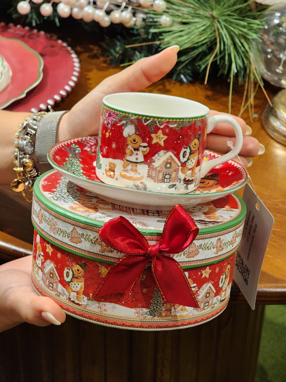 XÍCARA COM PIRES DECORADO EM PORCELANA COM CAIXA DE PRESENTE