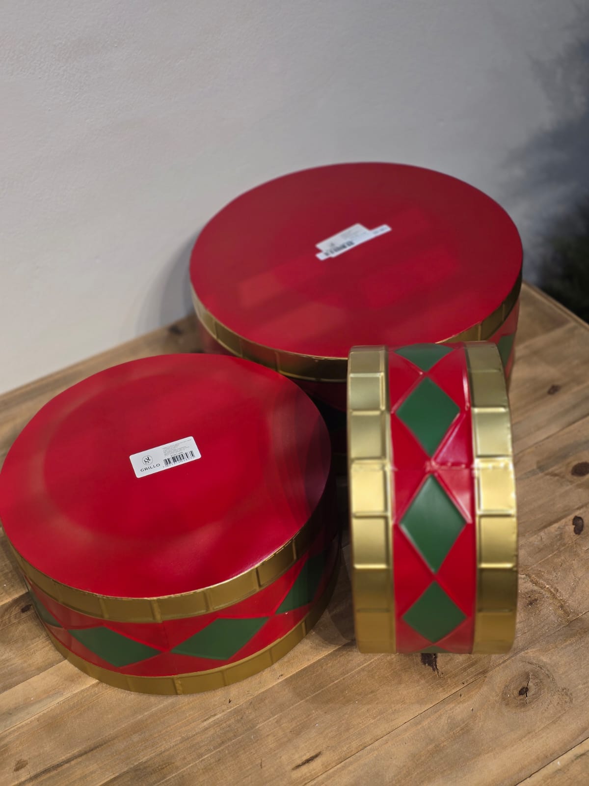 TRIO DE TAMBOR EM METAL DECORADO VERMELHO, VERDE E DOURADO