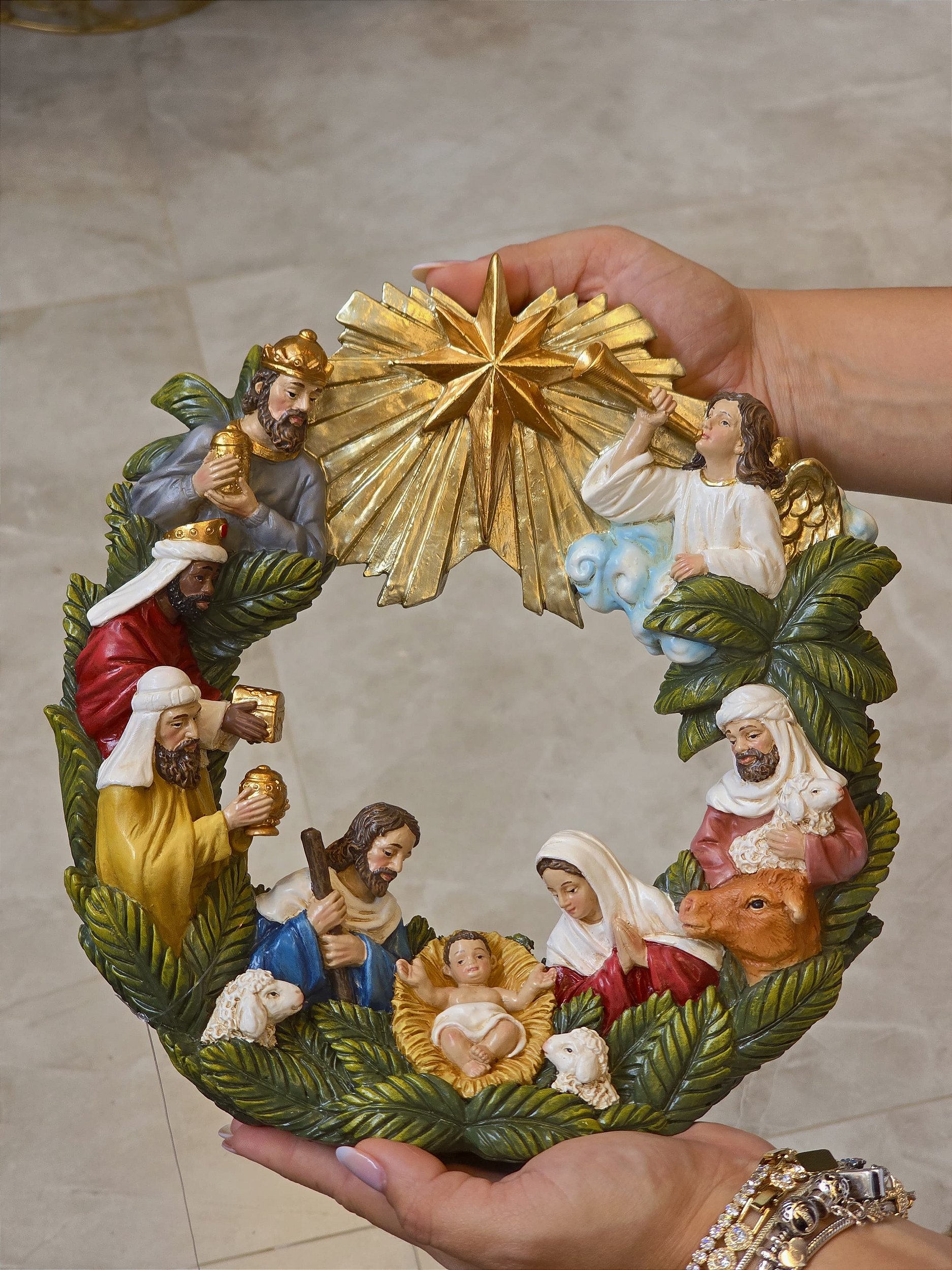 PRESÉPIO NA GUIRLANDA EM RESINA, PODE USAR PENDURADO POIS TEM UM GANCHO NA PARTE DE TRÁZ OU PODE USAR EM PÉ EM QUALQUER MOVEL.