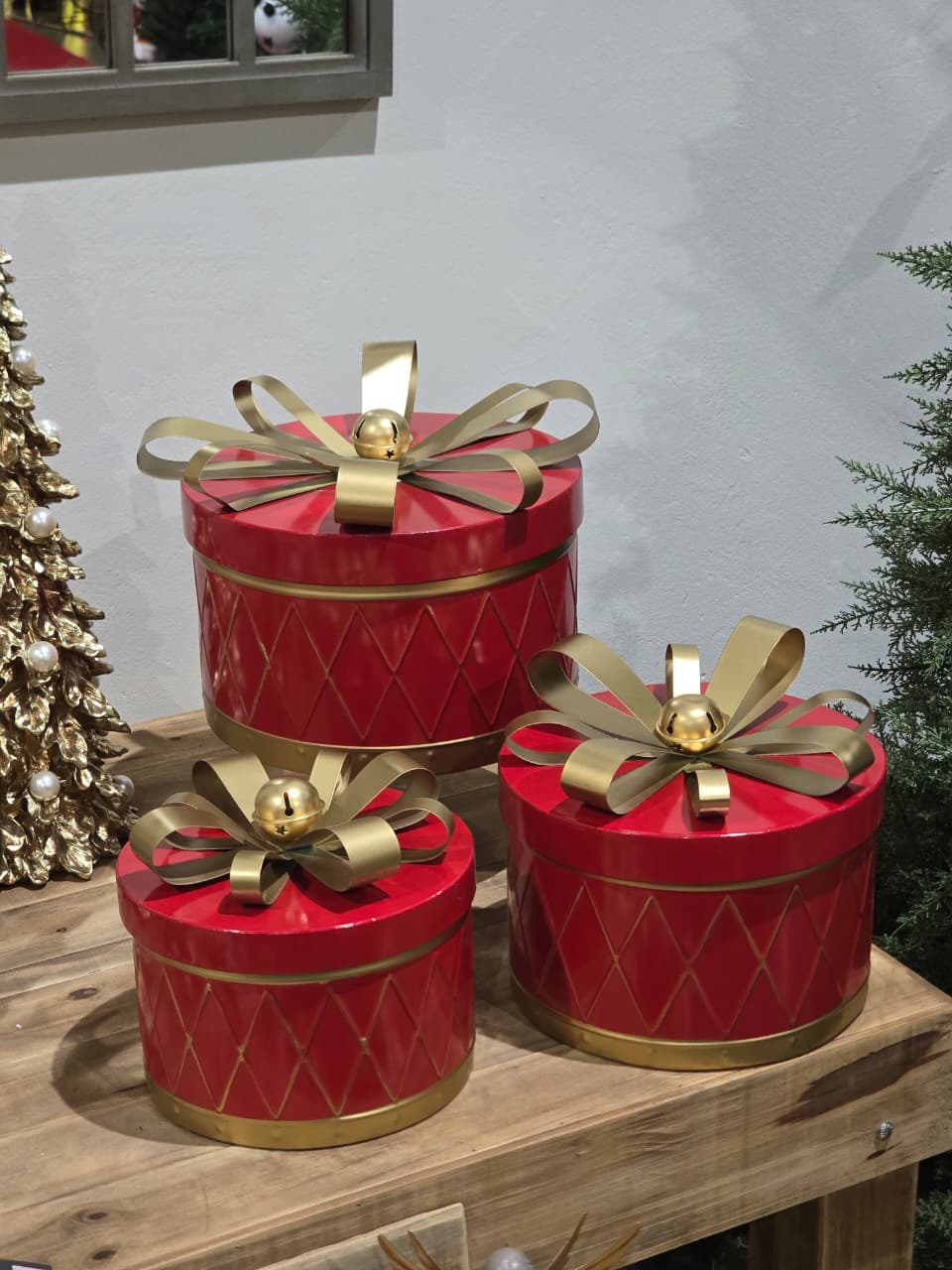 KIT COM 3 CAIXAS DE PRESENTES EM METAL COM TAMPA, PODE SER USADO PARA DECORAR OU COMO LATA PARA GUARDAR ACESSÓRIOS