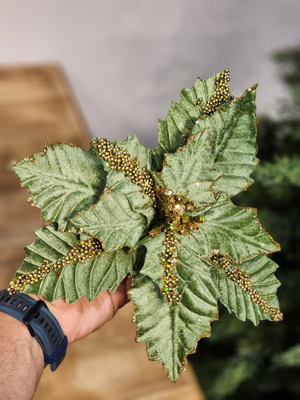 FLOR POINSETIA DECORATIVA VERDE E OURO 25CM
